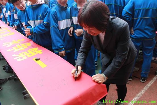 会议由初中部团委书记、九年级年级副主任黄科显主持。大会首先进行了庄严的升国旗仪式。随后由学生代表潘俊安同学发言,他代表全体九年级同学表达了奋战100天,夺取中考胜利的决心。教师代表陈日丽作了发言,她鼓励同学们在最后的100天里要分秒必争,希望同学们只要做到“但将汗水做甘露,欲与天公试比高”,六月定然会是出彩的一中人。紧接着由戴兴华校长助理向德育处主任、九年级年级主任农积勇授中考战旗,在农积勇主任的带领下,全体师生举起右手,握紧拳头,庄严宣誓:“百日冲刺,昂扬斗志;坚定目标,永不放弃;团结一致,共同努力;决战中考,勇夺第一;金榜题名,绽放美丽;看我一中,创造奇迹!”同一种语言,同一种声音,响彻了龙岗的上空!最后,《飞得更高》的旋律想起,九年级的老师和同学们,拿起手中的笔,在鲜艳的横幅上,庄严地签上自己的名字,留下了自己铿锵的誓言。