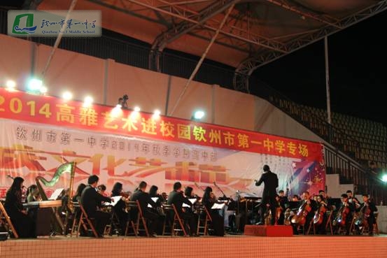 11月24日晚,“2014高雅艺术进校园”广西交响乐团专场音乐会在我校高中部运动场奏响,运动场灯火通明、气氛热烈。校党委书记、校长莫怀荣以及校级领导出席了音乐会现场,一同与全校师生聆听这场精彩绝伦的音乐盛宴。晚会主持由广西歌舞剧院演出部策划总监唐芳担任。